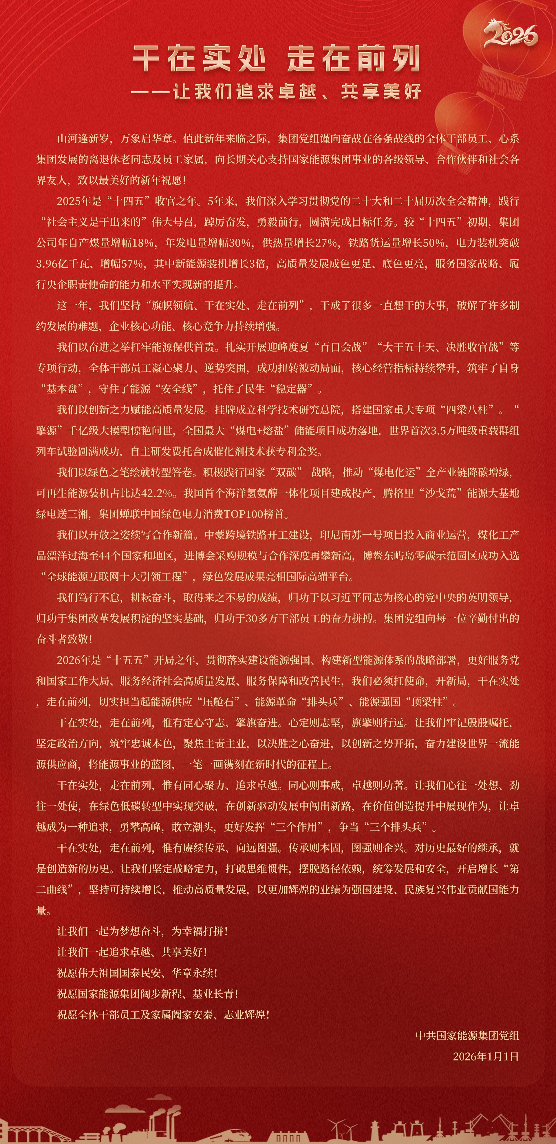 國家能源集團胸懷“國之大者”,增產(chǎn)增供、穩(wěn)價穩(wěn)市,積極服從服務國家戰(zhàn)略、保障國家能源安全、助力國民經(jīng)濟穩(wěn)增長,推動煤炭安全綠色智能、煤電清潔高效穩(wěn)定、現(xiàn)代煤化工高端多元低碳、運輸物流協(xié)同一體、新能源多元創(chuàng)新規(guī)?;l(fā)展,全力擔當能源強國頂梁柱,能源供應壓艙石,能源革命排頭兵。